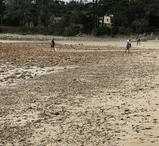 An der Meerseite der Bretagne richtet sich das Leben nach den Gezeiten. Überall hängen Gezeitenkalender, die man sich tunlichst abfotografieren sollte. Das ist vor allem für Strandläufer wichtig, denn kommt die Flut, muss man sich beeilen, um schnell wieder Festland unter den Füßen zu bekommen. Das Meer zeigt bei Ebbe seinen Grund. Da sind große und kleine Steine, Algen, Muscheln, Meerschnecken und alles was so am Meeresgrund existiert und die Ebbe überlebt. Vieles davon kann man essen, daher sieht man bei Ebbe reichlich Leute, die mit Netzen und Eimern ausgestattet „Meeresfrüchte“ für die nächste Mahlzeit einsammeln. Die Flut kommt rasch. Das unterschätzen viele Urlauber und wagen sich oft zu weit hinaus, was nicht ungefährlich ist, weil der Atlantik recht ruppig ist. Man findet hier auch riesige Austernbänke. Austern aus diesem Abschnitt Frankreichs gehören zu den besten der Welt. Es gibt wahrscheinlich nichts, was den Geschmack des Meeres besser einfängt als Austern und bevor ihr igitt sagt, bitte erst probieren!