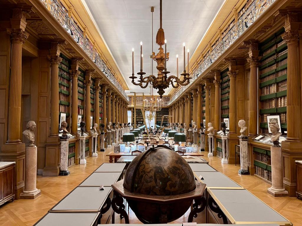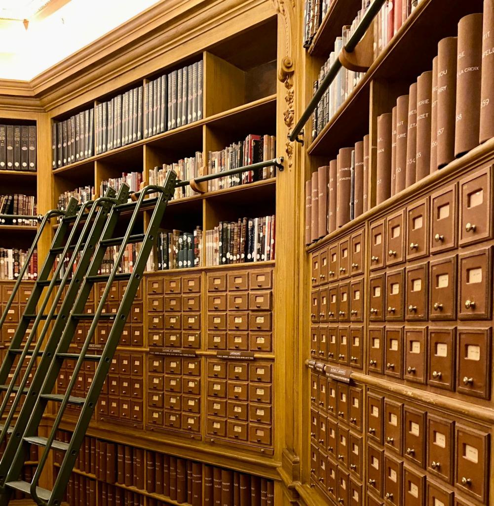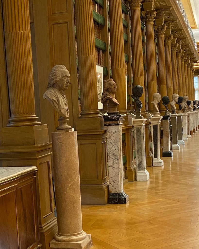 Ich kann jetzt nicht schreiben, dass es mir die Sprache verschlagen hat, als ich die Bibliothéque betrat, denn gesprochen werden darf nicht, man kann allerhöchstens leise flüstern. Aber ich habe tatsächlich die Luft angehalten. Der Anblick der Räume, vor allem des großen Lesesaals ist… atemberaubend. Die historische Einrichtung von 1691 ist noch erhalten. An den Wänden reihen sich die Bücher in wunderschönen alten Holzregalen und sind teilweise über alte Leitern zu erreichen. Mittig im Lesesaal sind Tische angeordnet und mit PCs ausgestattet, denn heutzutage sind natürlich alle Werke digitalisiert. Da wir Besucher waren, konnten wir weder einen Blick auf einen PC werfen, noch auf einem der Stühle Platz nehmen. Das ist den Forschenden vorbehalten, die hier in Ruhe arbeiten wollen. Auch der Dielenfußboden ist historisch und knarrte bei jedem unserer Schritte, was uns etwas peinlich war. Die Räume strahlen eine ganz besondere Atmosphäre aus. Das Wissen von Jahrhunderten, aufbewahrt in tausenden Büchern, hat uns tief berührt und es war schwer, den Weg zurück in die wuselige Stadt zu gehen.
