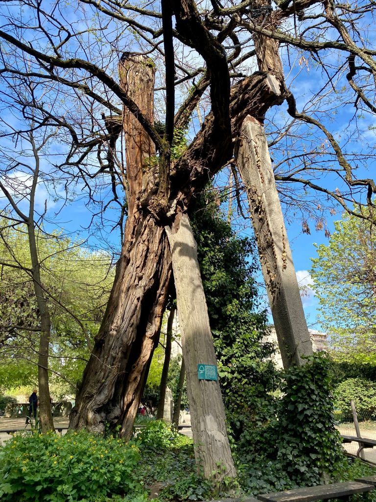 Zum Abschluss des Tages standen wir noch vor der Kirche St-Julien-le Pauvre, ein Gotteshaus mit einer bis ins 6. Jahrhundert zurückreichenden, überaus wechselvollen Geschichte. Es fällt heute schwer, sich die prunkvollen Zeiten dieser Kirche vorzustellen. Eine wunderbare Zeremonie des Mittelalters fand in diesen Gemäuern statt. Die Rektoren der Sorbonne wurden hier gewählt und bekamen den Hermelinmantel umgelegt und das Siegel der Universität überreicht. Von den glanzvollen Tagen ist nichts mehr übrig. Geblieben ist ein Ort der Stille und Einkehr, in dem der Lärm der Stadt keinen Zugang hat. Im seitlichen, kleinen Park wächst, mittlerweile durch Pfähle abgestützt, der älteste Baum von Paris, eine Robinie, durch deren Äste die Türme von Notre Dame schimmern.