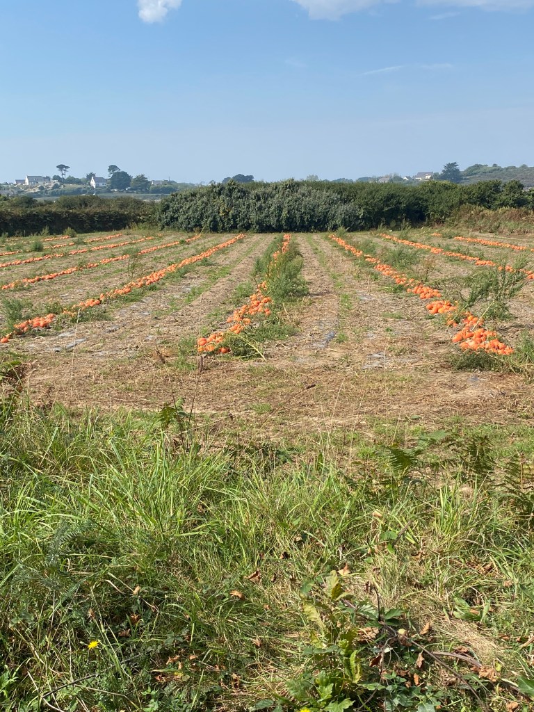 Unser Haus lag in der Nähe eines Abers, das sind Meeresarme, die sich in das Festland eingraben und aussehen wie Fjorde. Die vielen Abers dieser Gegend geben der Küste ihren Namen ‚Côte des Abers‘. Das Ferienhaus lag inmitten von Kürbisfeldern, deren Früchte leuchtend orange in der Sonne reiften und noch während unseres Aufenthaltes geerntet wurden. Das Haus war stabil aus Holz gebaut und komfortabel eingerichtet. Leider konnte man das Wasser vom Haus aus nur erahnen, weil gefühlt ständig Ebbe war und die Flut in dieser Woche dort nur zu sehen war, wenn wir unterwegs waren.