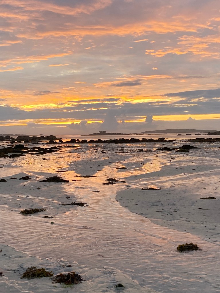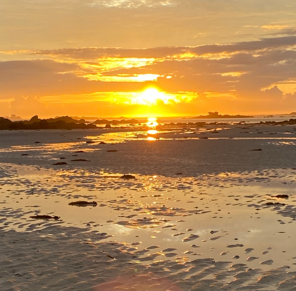 Eine dieser Entdeckungen waren die ‚Dunes de Sainte-Marguerite‘, die uns alle in Staunen versetzt haben. St. Marguerite ist eine große Halbinsel mit weiten, weißen Stränden und einer umwerfenden Dünenlandschaft. Es ist ein riesiges Naturschutzgebiet mit feinem Sand und vielen Wegen, die man erlaufen kann. Im Sommer werden die Strände von Familien und Sonnenhungrigen belegt, im Spätsommer sind Spaziergänger und Wanderer unterwegs. Gleich am Anfang haben wir uns abends aufgemacht , um den Sonnenuntergang zu sehen. Selbst jetzt noch bin ich überwältigt von dem Eindruck, den dieser hinterlassen hat. Das Auto kann auf ausgewiesenen Parkplätzen abgestellt werden, um zu Fuß die Dünen zu erreichen. Netterweise war gerade Ebbe, die Sonne neigte sich dem Untergang zu und gab uns einen Eindruck, wie das Paradies wohl aussehen mag. Wahrscheinlich war dieser Sonnenuntergang der Grund, dass wir drei auch in den beiden kommenden Jahren unseren Urlaub an dieser Küste verbracht haben.