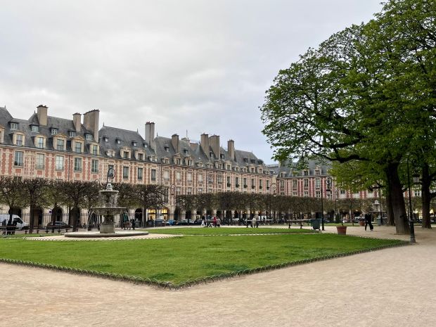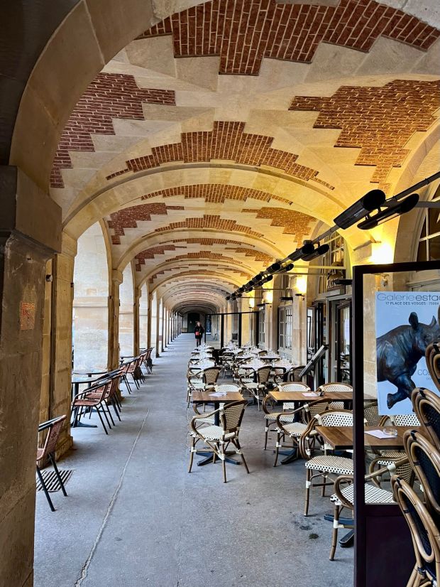 Da wir uns viel zu erzählen hatten und die Zeit dabei wie im Flug vergangen ist, mussten wir uns noch beeilen, um wenigstens einige Sehenswürdigkeiten des Marais‘ zu besuchen. Sehr bekannt, viel besucht und auf jeden Fall eine Besichtigung wert, ist die ‚Place des Vosges‘ (spricht sich mit einem ganz weichen sch in der Mitte). Ein Platz in vollkommener Harmonie mit den darum angeordneten einheitlichen Häusern. Wobei „Häuser“ die Untertreibung des Jahrhunderts ist. Es sind alte Stadtpaläste, in denen man nicht einfach wohnt, sondern residiert. Sehr schön sind die Arkaden dieser Häuser, die mit Kunstgalerien, Restaurants und feinen Geschäften gesäumt sind. Hier befindet sich auch die ‚Maison de Victor Hugo‘, die besichtigt werden kann (Häuser und Plätze sind im Französischen weiblich) und das bezaubernde Hotel ‚Le Pavillon de la Reine‘, leider weit außerhalb unserer Preis-Möglichkeiten. Der Place des Vosges ist sehr groß und man sollte einiges an Zeit einplanen, damit man man auch einen Blick in die Arkaden werfen und eine Weile auf den zahlreichen, alten Bänken dieses Platzes verweilen kann.