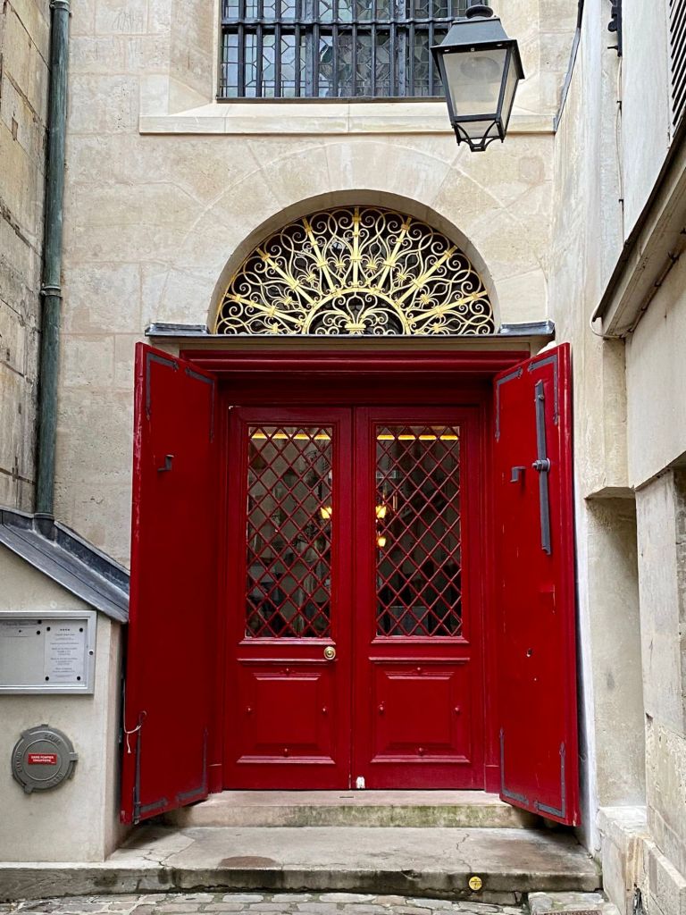 Da es schon recht weit fortgeschritten am Nachmittag war, haben wir nur noch das ‚Village Saint Paul‘ anschauen können. Dort waren wir nicht zum ersten Mal und erneut echt beeindruckt, was dort entstanden ist. Wie der Name schon verrät ist es ein Dorf in der Stadt mit kleinen Gassen, stillen Plätzen (auf jeden Fall um diese Zeit) und einem Gewirr von Höfen. Eigentlich sollte man nur geradeaus gehen. Aber wir haben uns total darin verloren und sind von einem Hof in den anderen geraten, völlig ohne System. Da es mehrere Zugänge zum Dorf gibt findet man auch den Weg wieder heraus, aber so übersichtlich, wie unsere Beschreibung versprach, war es keinesfalls. Die Geschäfte hatten schon geschlossen, auch das traumhafte ‚Musée de la Curiosité et de la Magie‘ ein Zaubereimuseum. Es ist beeindruckend, was aus den alten, zum Teil verfallenen Häusern geworden ist. In irgendeinem Hof, sie sind alle zur besseren Orientierung farblich unterschiedlich markiert, hängen große Schautafeln, die die Entstehungsgeschichte des Village zeigen. Am Anfang unseres Rundgangs haben wir auch die Kirche St-Paul-St-Louis besucht, deren rote Eingangstüre eine gewisse Sogwirkung auf uns hatte.